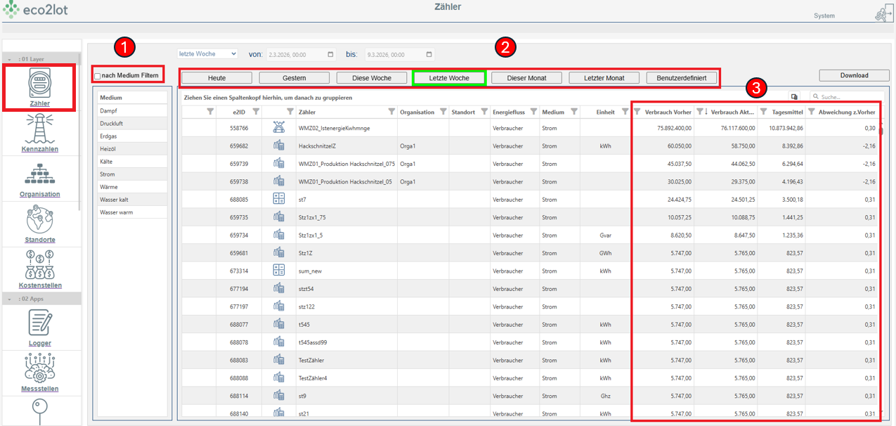 ) aus, werden für alle Zähler die Verbräuche der letzten Woche sowie der Woche davor berechnet.